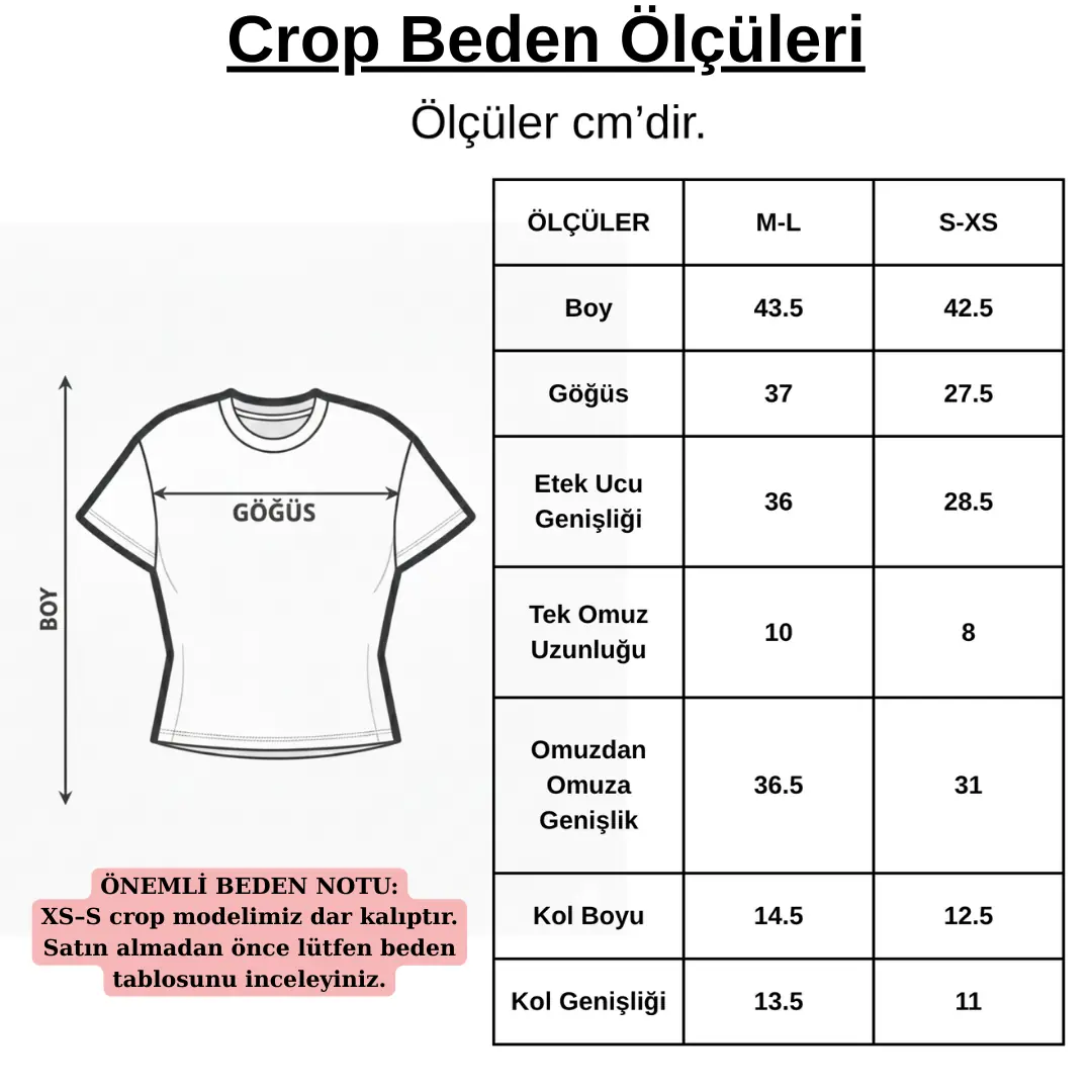 XS–S crop modelimiz dar kalıptır. Satın almadan önce lütfen beden tablosunu inceleyiniz.